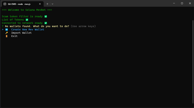 When launching the project through Visual Studio Code, the main menu of MevBot Solana will open: