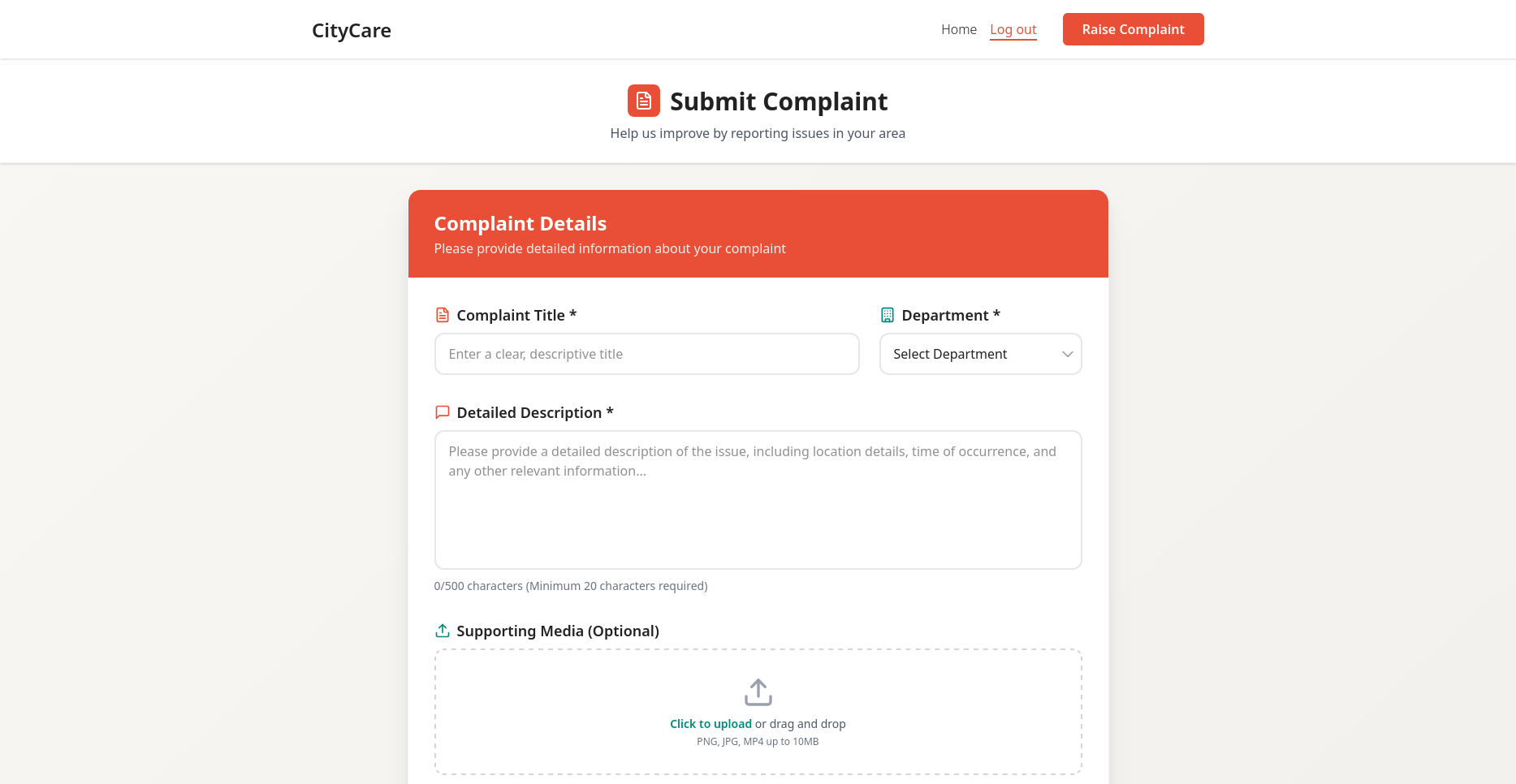 - Raise Complaints — Submit detailed reports with descriptions, images.
