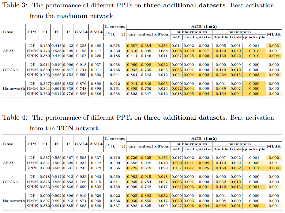 To strengthen the claimed benefits of this proposed method, we trained the state-of-the-art TCN model [5] from scratch with the data augmentation following the tutorial [6] using SMC [7], HJDB [8], Hainsworth [9], Ballroom [10, 11], and Beatles [12]. As the purpose of these experiments are to gain insights into the behaviors of SOTA beat trackers, rather than to compare their performance, we demonstrate the results in Table 1 (madmom) and Table 2 (TCN) separately. It can be seen from the distribution of the colored cells that the TCN network exhibits similar metric-level behaviors as the madmom network does.