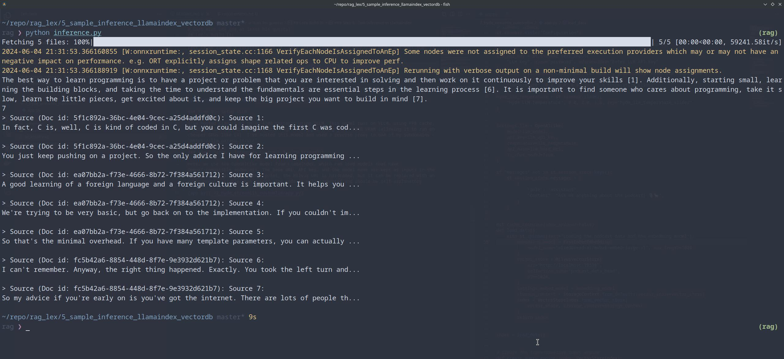 At this stage, we are going to put together our VectorDB and embedding model with LlamaIndex and test if we can do a retrieval with it. This script loads up the embedding model and VectorDB. If you get an output at this stage, congrats! The setup is done! Kinda...