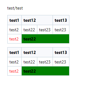 | {color=red} test2 | {colspan=3, bgcolor=green} **test22**