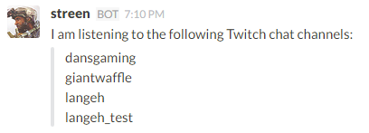 Lists the current Twitch chat channels that Streen is listening to.