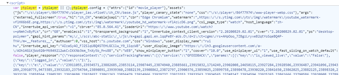 再说他的链接,他应该还有一种选择就是把打包好的json信息,我们想要的视频链接也在json中,作为视频内容传给h5播放器,但既然是内容的传递那么这个方法八成不在加密算法文件base.js中,经过元素审查关键词ytp、player很容易找到了ytplayer这个js变量,youtube player起名字相当随便(第一次找链接就是这样找到的),无论是审查元素还是网络都能很好地验证