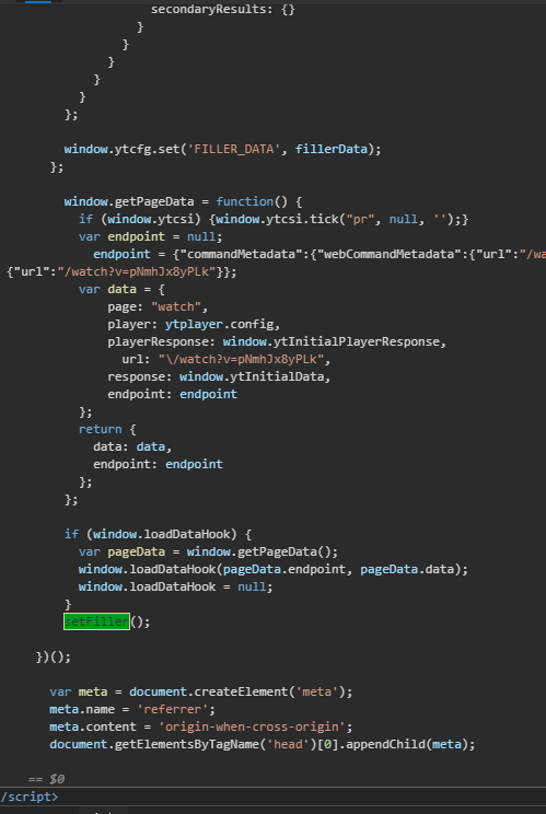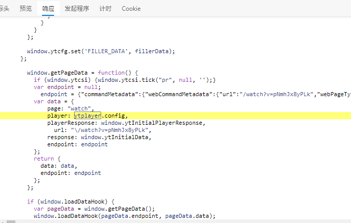 其中"player_response"包含各种质量的视频的来源以及信息,如果按照80字符一换行,里面大概有1000多行。其中视频与音频是分离的,从48k到320k,从144p到8k都有明确的提示信息,之后的流程就是多层套娃,player_response外面套ytplayer.config外面套data外面套pageData外面套window.getPageData外面套fillerData外面套setFiller,每套一层就额外增添一些判断条件或者信息,最后打包成为h5播放器可以识别的信息在播放器完成播放,套娃如下