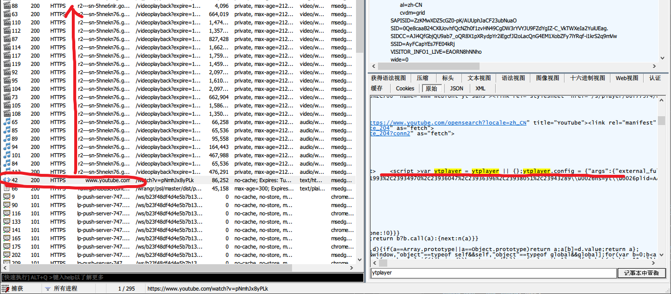 打开配置好的Fiddler后再打开ytb的视频页面,捕获页面中就会刷新出请求过的链接,无论是否响应