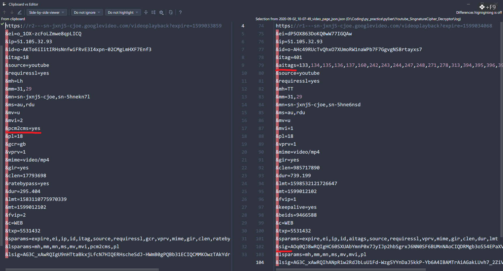 使用正则式完成从url检测到流媒体信息的提取,其中的一个坑就在键"streamingData",也就是上文所说的那一点出入,有的视频信息后面跟的是"playbackTracking",有的是"playerAds",都是小问题