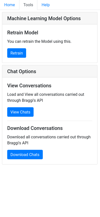 Open http://127.0.0.1:8000/braggi/ to view the data. Open http://127.0.0.1:3000 to view the chat UI Open http://127.0.0.1:8000/api-admin/login to login and head into the dashboard for all the Admin glory.