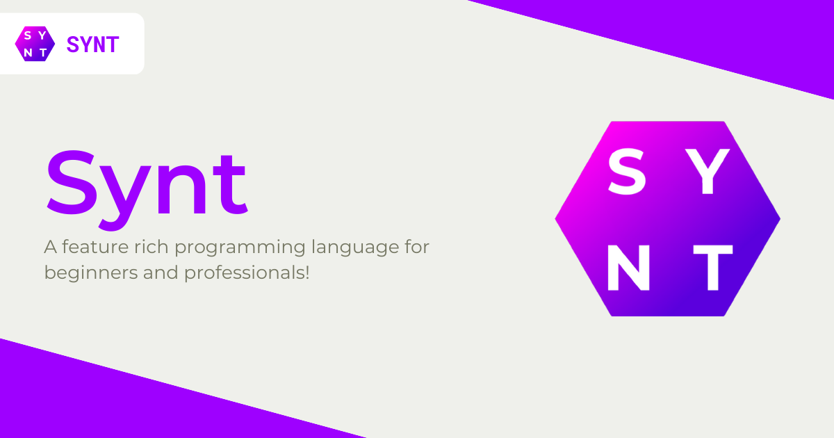 Synt is free and open source. It is made with Python. Synt is the next gen programming language. It is made so that updates are easy and fast. Synt is made to make software and game development easier and faster.