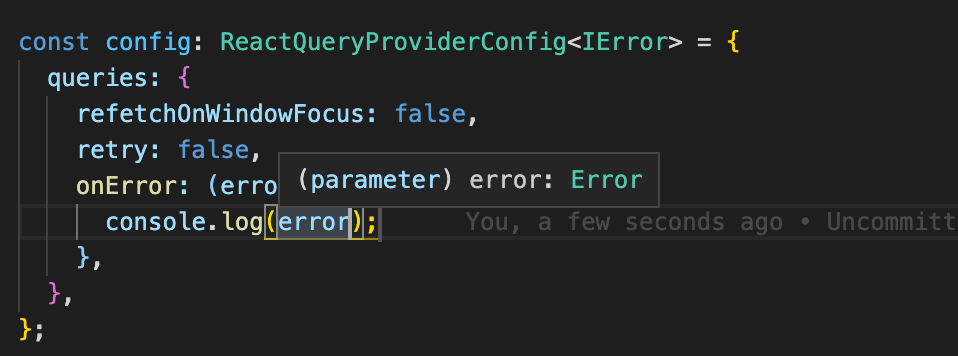 `ReactQueryProviderConfig` doesn't pass provided error type to `onError` callback **Expected behavior** ` const config: ReactQueryProviderConfig<IError> = { queries: { onError: (error) => { // error is type Error not IError }, }, }; ` <img width="479" alt="Screen Shot 2020-07-08 at 16 39 23" src="https://user-images.githubusercontent.com/11874281/86919657-a09a8800-c139-11ea-908a-7380e41e35c2.png">