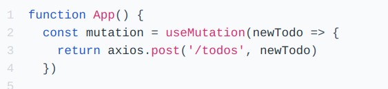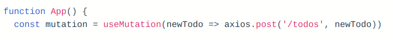 useMutation(newTodo => axios.post('/todos', newTodo))which was very confusing for me when I tried to code and it didn't work. It took me a very long time to notice that small detail.I think the return statement will drastically remove that confusion.