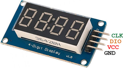 Modules based on TM1637 chip provide two signal pins (CLK and DIO) and two power pins (VCC and GND):