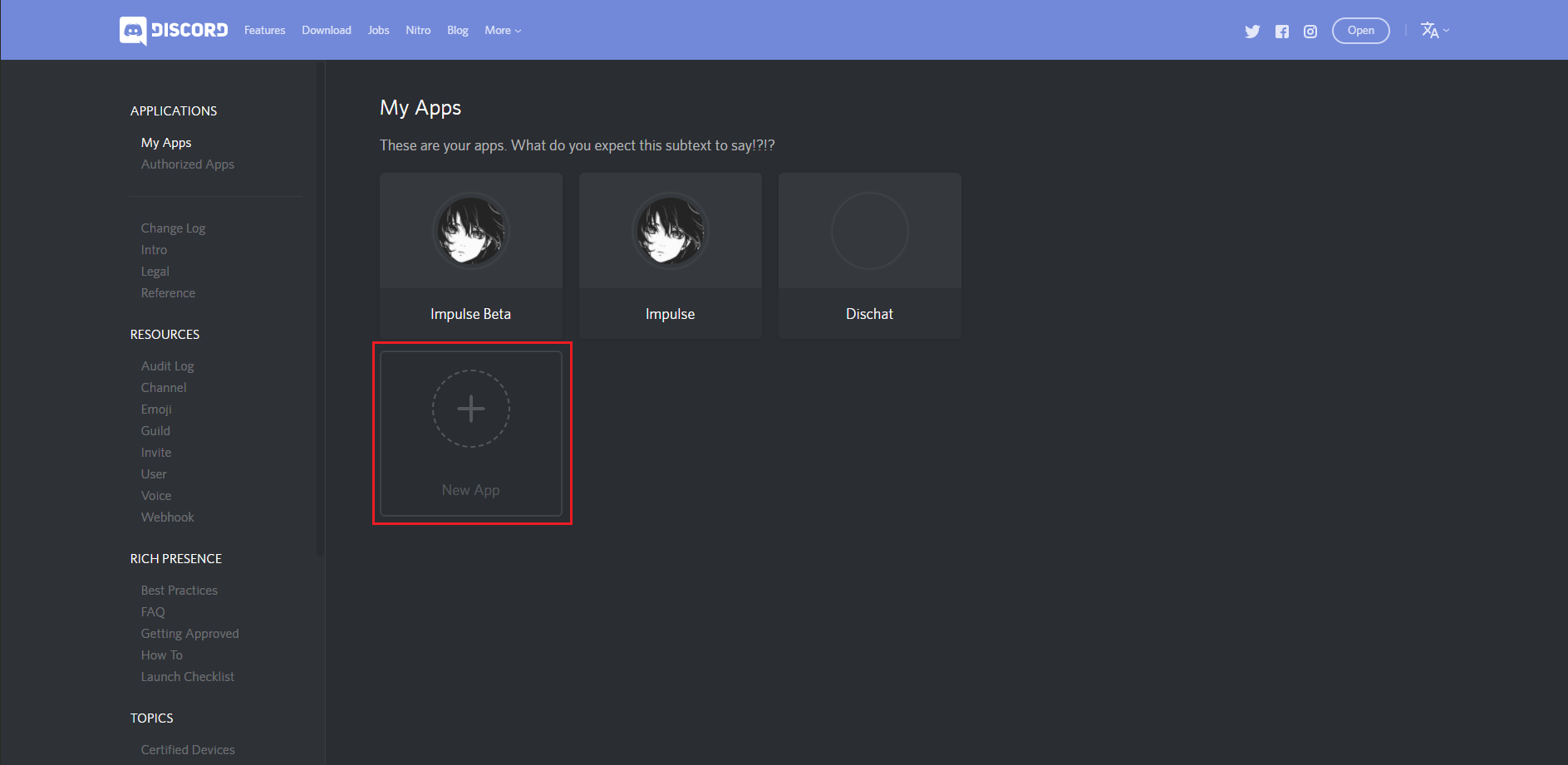 Go to https://discordapp.com/developers.Click My apps in the top left: