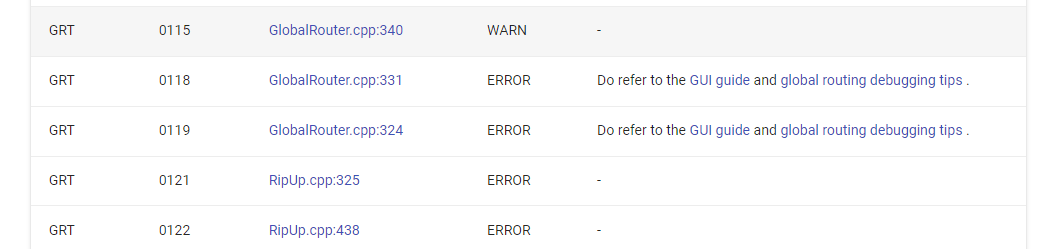 I think that these This looks great and is an example of the above. Here we can add the links to the GUI with the instructions. Later, other developers can add tips to users on which knobs to turn to avoid the error message. FYI @maliberty, @vijayank88. We can start curating information that we often see in issues and discussions to add to the table. Congestion is a big one that I often see repeating in many places. |