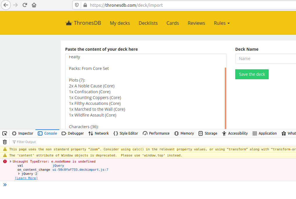 Unlike Chrome, this feature currently does not work at all in Firefox due to a JS error.  spotted in the console: ``` Uncaught TypeError: e.nodeName is undefined val jQuery on_content_change ui-50c0faf733.deckimport.js:7 jQuery 2 jquery.js:7328:4 ```