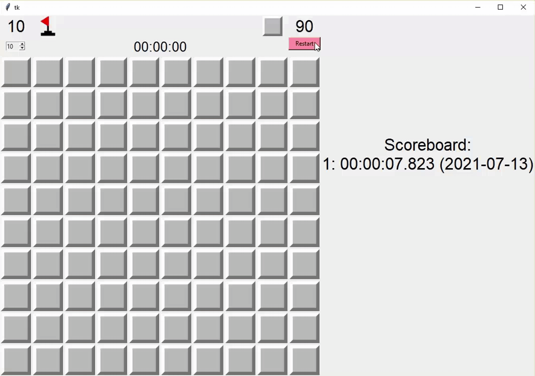 This is a classic game known as Minesweeper where the goal is to clear the play area of safe squares. If a square with a mine is clicked, the game ends. Left click reveals a square (safe or mine) and right click adds a flag to square which prevents accidentally clicking on it. Empty squares will reveal all adjacent empty squares and border squares just like in the original game. Also clicking on an already revealed square will reveal adjacent squares if there are a right number of flags around it. This will fail the game if flags are in incorrect positions. The number on the top left shows how many mines there are left and the number on top right shows how many safe squares are unrevealed. The spinbox on the top can be used to adjust the amount of mines.
