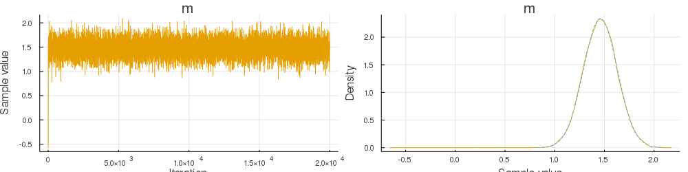 gdemoexample still fails. I'm not sure why this is the case and assume there is some problem with how ESS is integrated in the Gibbs sampler - I guess I forgot to implement something related to Turing's internals or implemented it incorrectly.You can check the MATLAB implementation from Ian Murray, one of the original authors, for a comparison: https://homepages.inf.ed.ac.uk/imurray2/pub/10ess/elliptical_slice.m