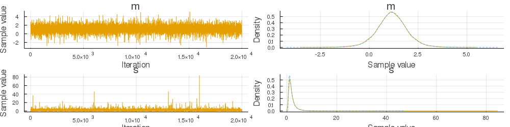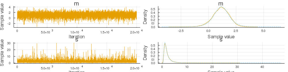 endsuccessfully. I created plots of the trajectories and the true (dashed blue) and approximated (orange) posterior (code): |