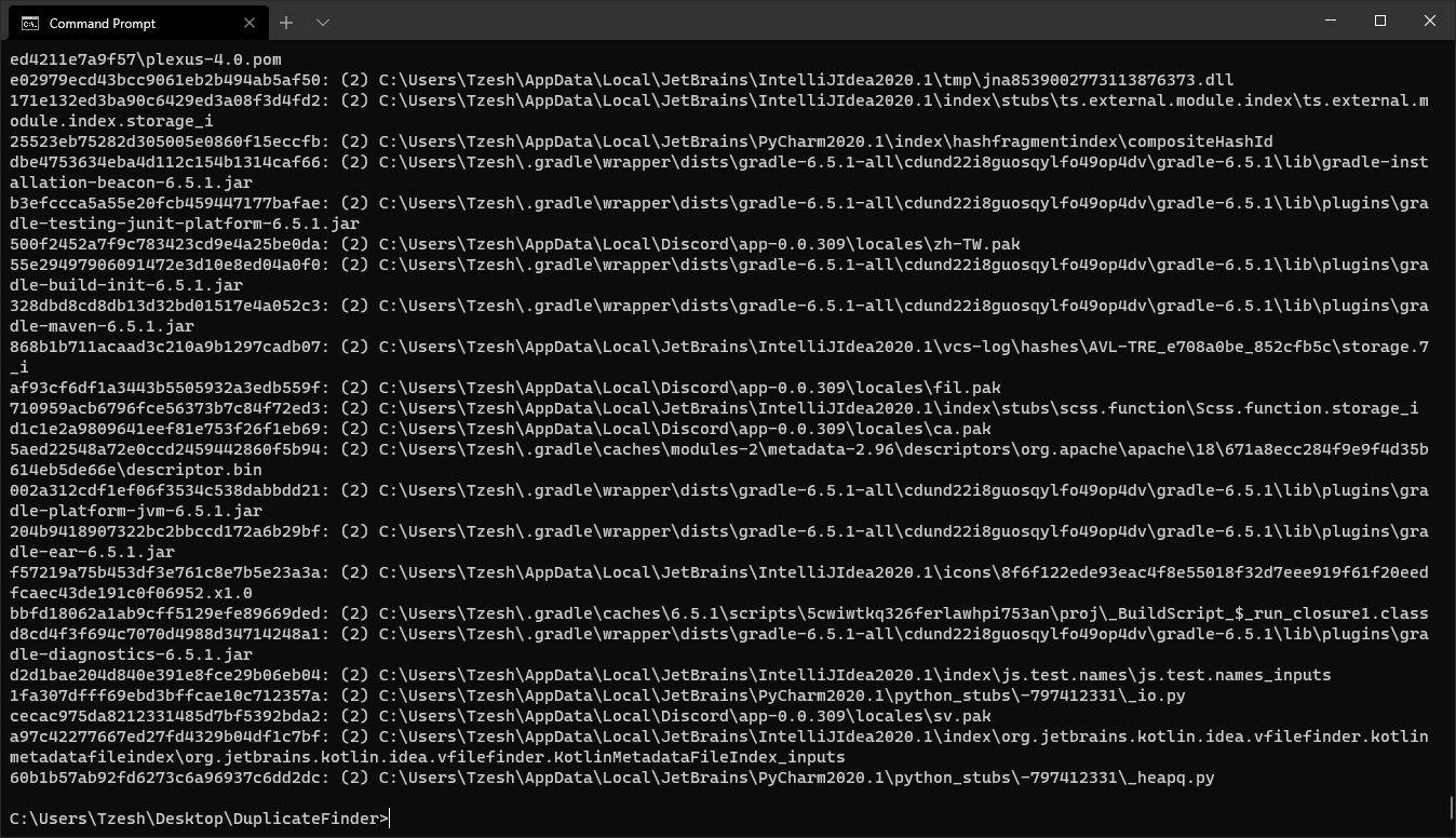 DuplicateFinder just simply looks for duplicates located in your 'user.home' directory, which is 'C:\Users\Tzesh' in Windows or '/home/Tzesh' for Linux. Maps them according to their MD5, and controls if there is a collusion or not.