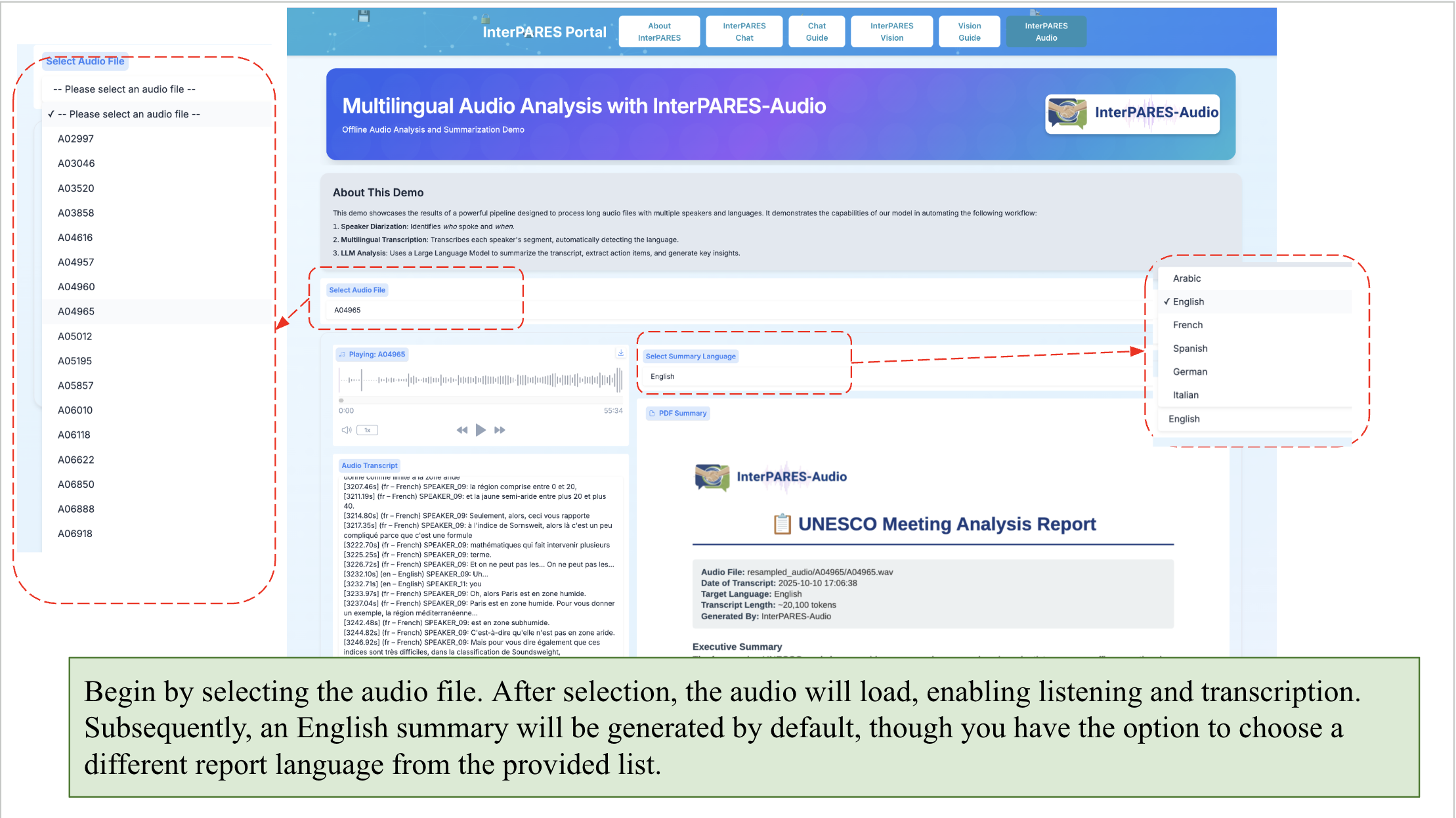 InterPARES-Audio is a sophisticated system designed to listen, transcribe, translate, and analyze complex audio recordings. It is built to handle files with multiple speakers conversing in different languages, making it the ideal tool for processing archives of meetings, interviews, and panel discussions.