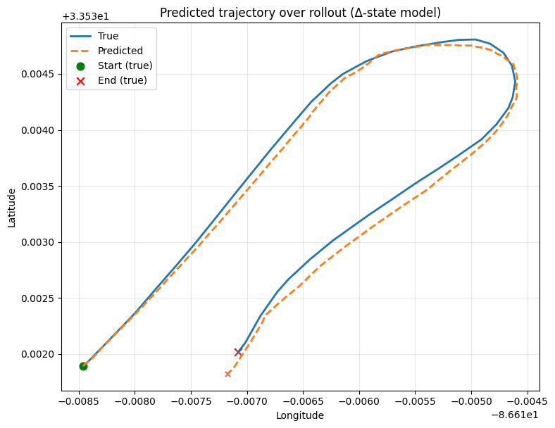 - Our model achieved impressive accuracy, being able to correctly predict the position of any car (including cars it wasn’t trained on) within a few meters up to 30 seconds given an initial position and driver input.