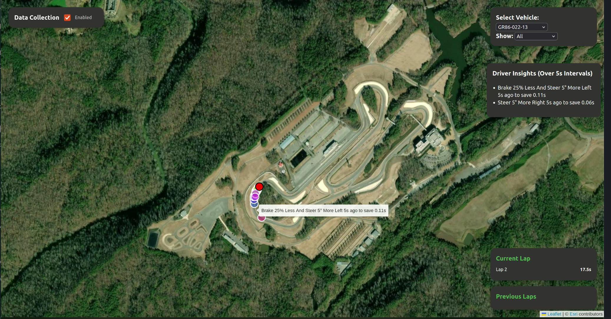 - Enable or disable 'Data Collection' to effectively pause the simulation. This give you time to think about driver insights! Time is still ticking so unpausing will update the cars to their latest location instead of simply continuing off. We did this to make our application real-time.