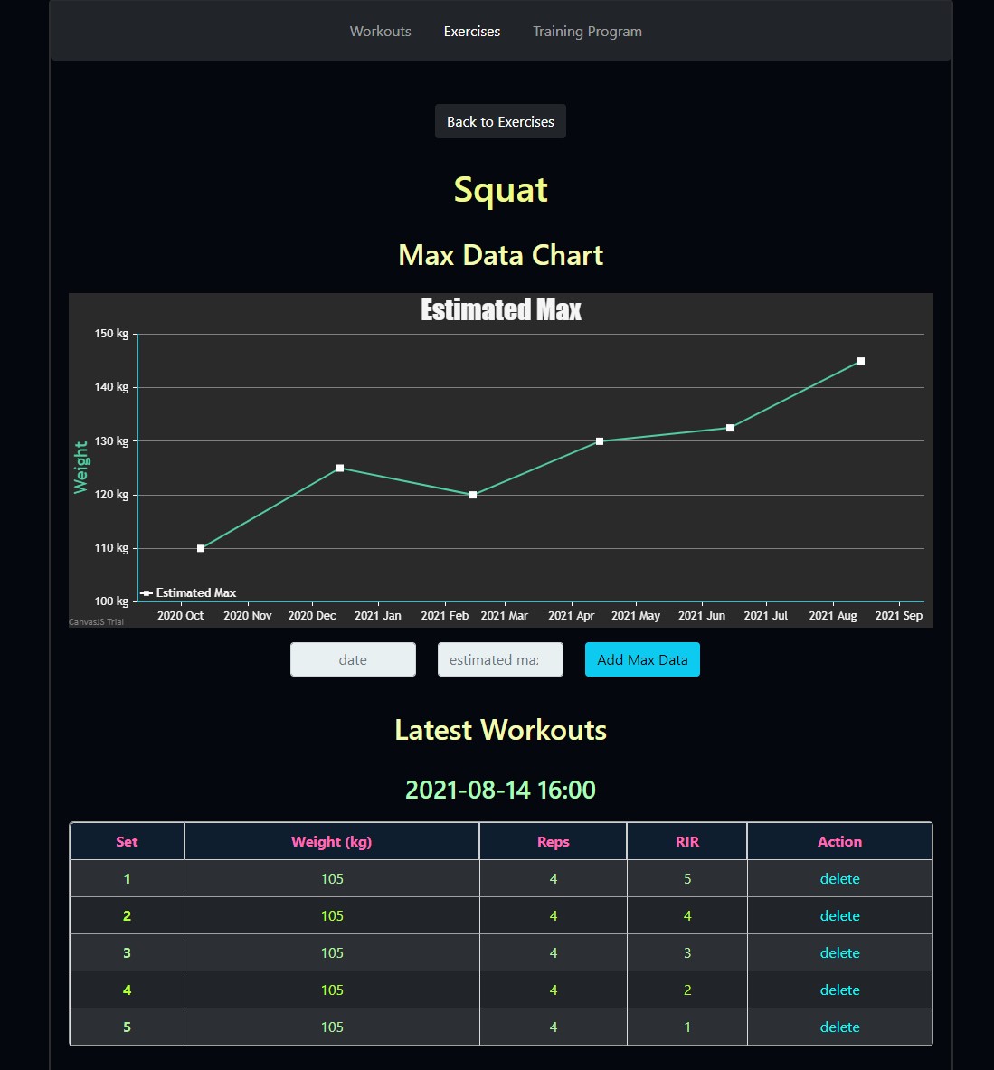 The project also contains a workout log client (frontend) utilizing the API. The client uses the hypermedia links to find the URLs to the needed resources. It is implemented with HTML, CSS, JavaScript and jQuery.