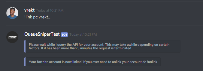 !cancel <gamemode>- Cancels a match that has started collecting codes.!start <gamemode> (optional) #channel- Starts a snipe match, if you specify a channel then all embeds will go there.!lock- Locks a channel!unlock- Unlocks a channel!link <platform> <name>- Allows players to link their Fortnite accounts, this is not verified.!unlink- Allows players to unlink their Fortnite account.- If you are an administrator you can unlink other players account like this