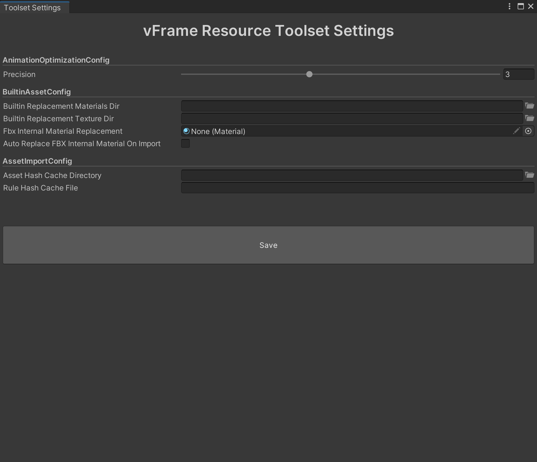 通过菜单 Tools -> vFrame -> Resource Toolset -> Settings 打开设置面板