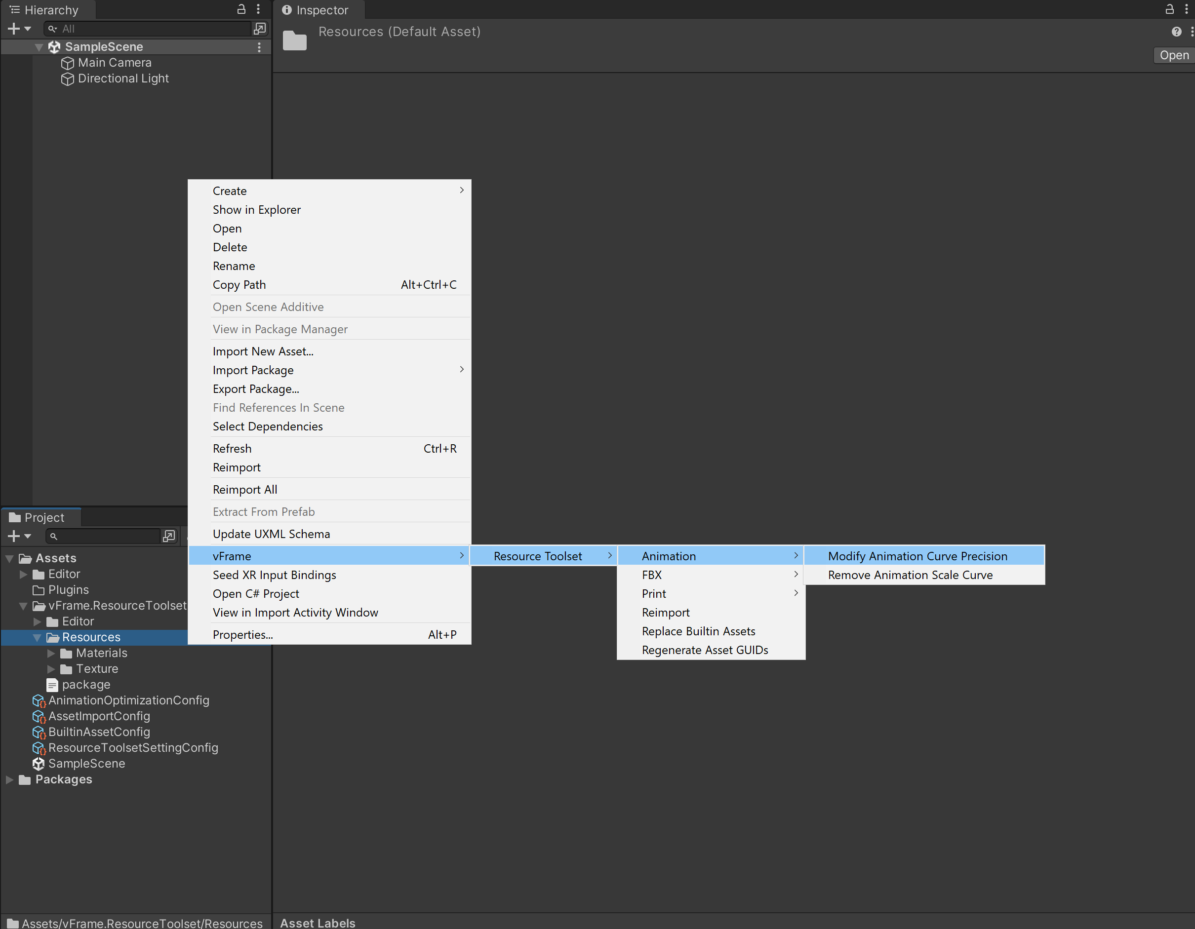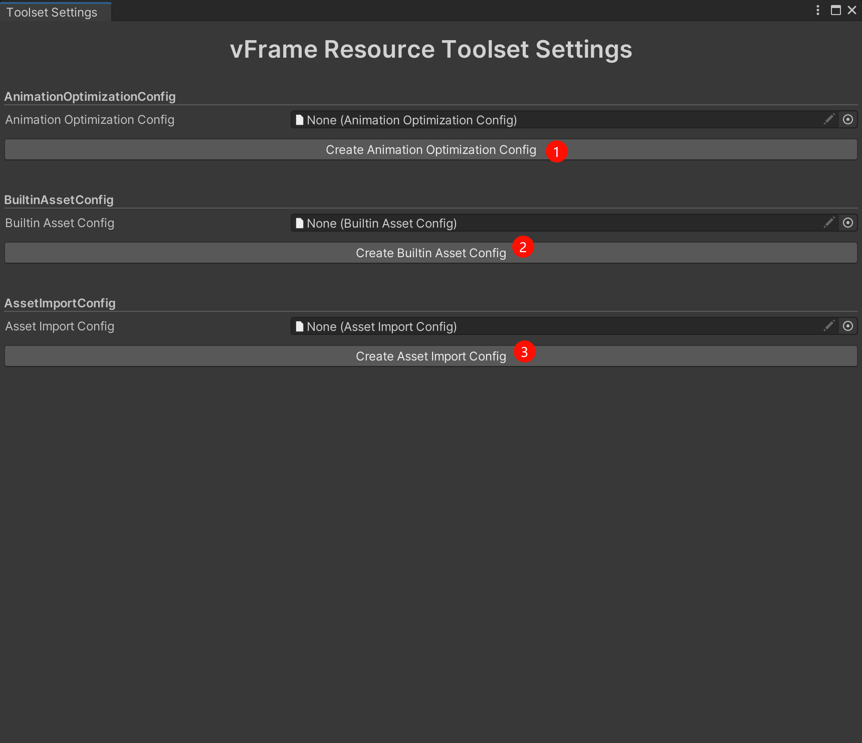 可通过菜单 Tools -> vFrame -> Resource Toolset -> Asset Importer 来打开面板