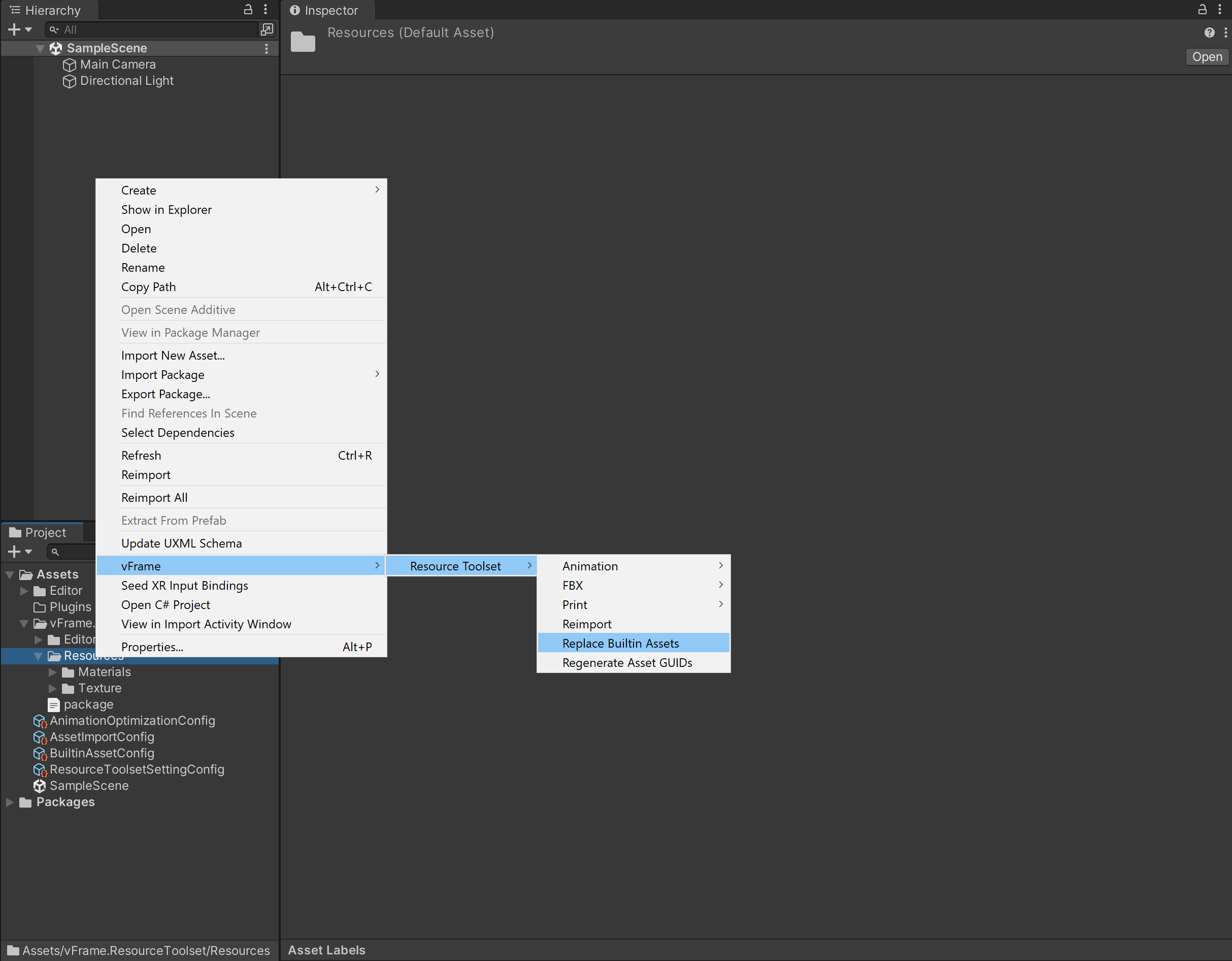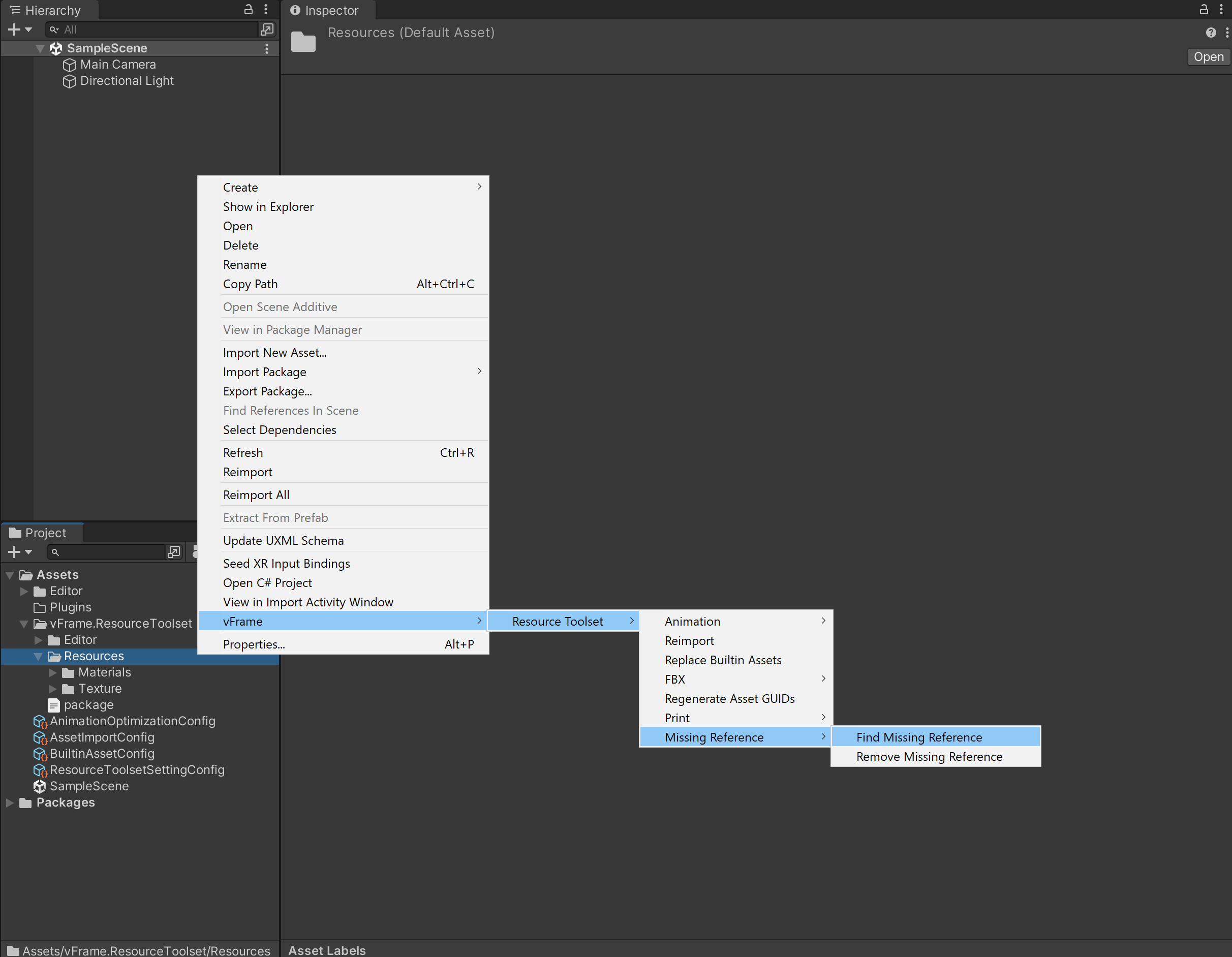 可通过菜单 Tools -> vFrame -> Resource Toolset -> Asset Migrator 来打开面板