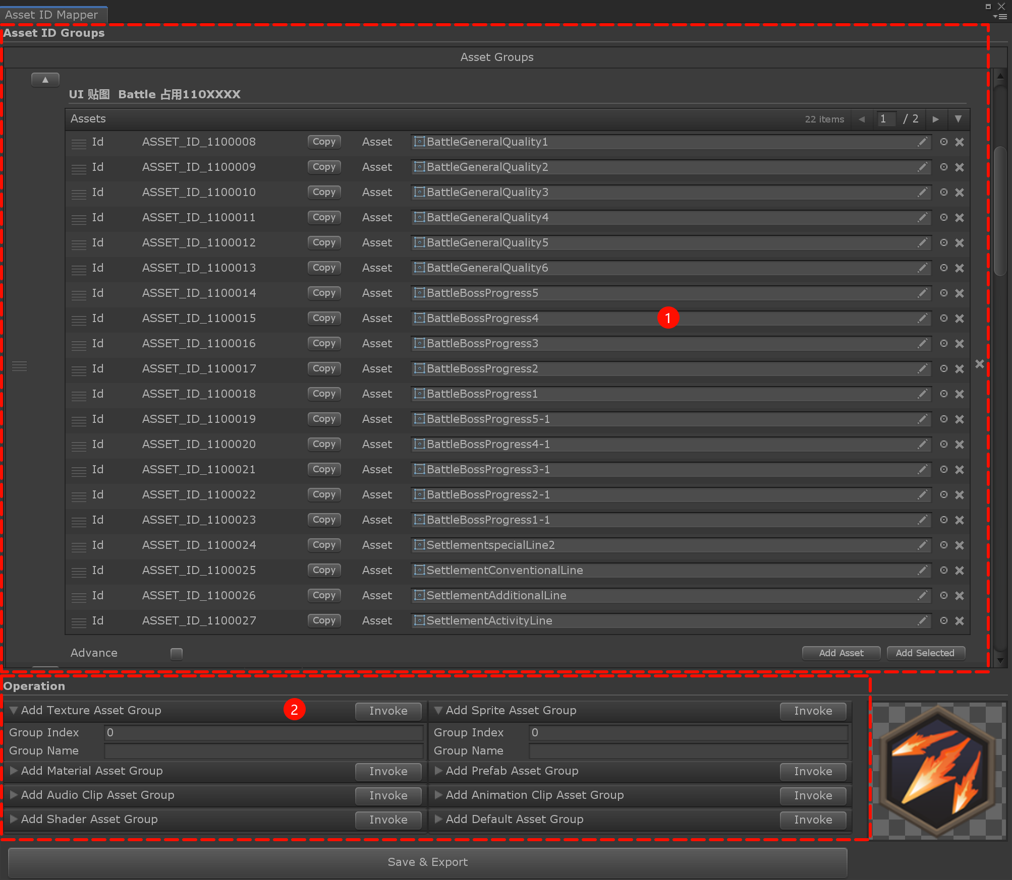 当所有资源映射关系建立或者修改完成后,点击Save & Export按钮,会进行保存以及输出映射关系数据。映射数据结构为一个字典,ID -> 文件路径,实际加载资源时仍然是根据资源路径来进行加载。