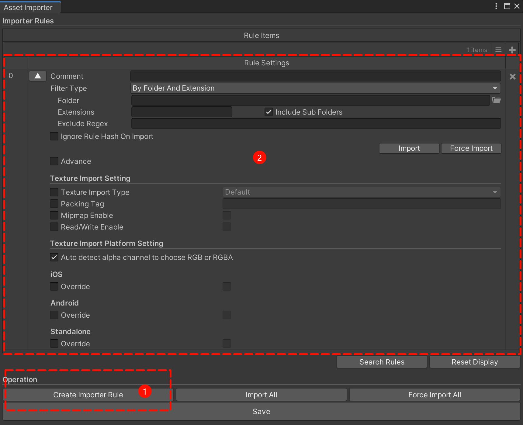 首次打开,需要点击Create Importer Rule来创建你的第一个规则,在界面中间弹出的规则类型框选择需要的规则(目前只支持贴图资源的设置)。