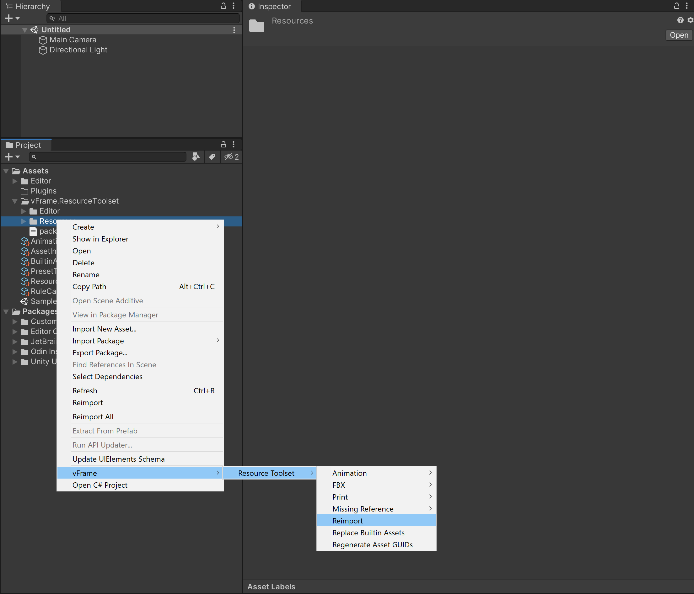 注意跟 Unity 菜单上自带的Reimport/Reimport All菜单的区别,只有通过vFrame/Resource Toolset入口下的Reimport才会执行该资源匹配到的规则然后执行导入流程。