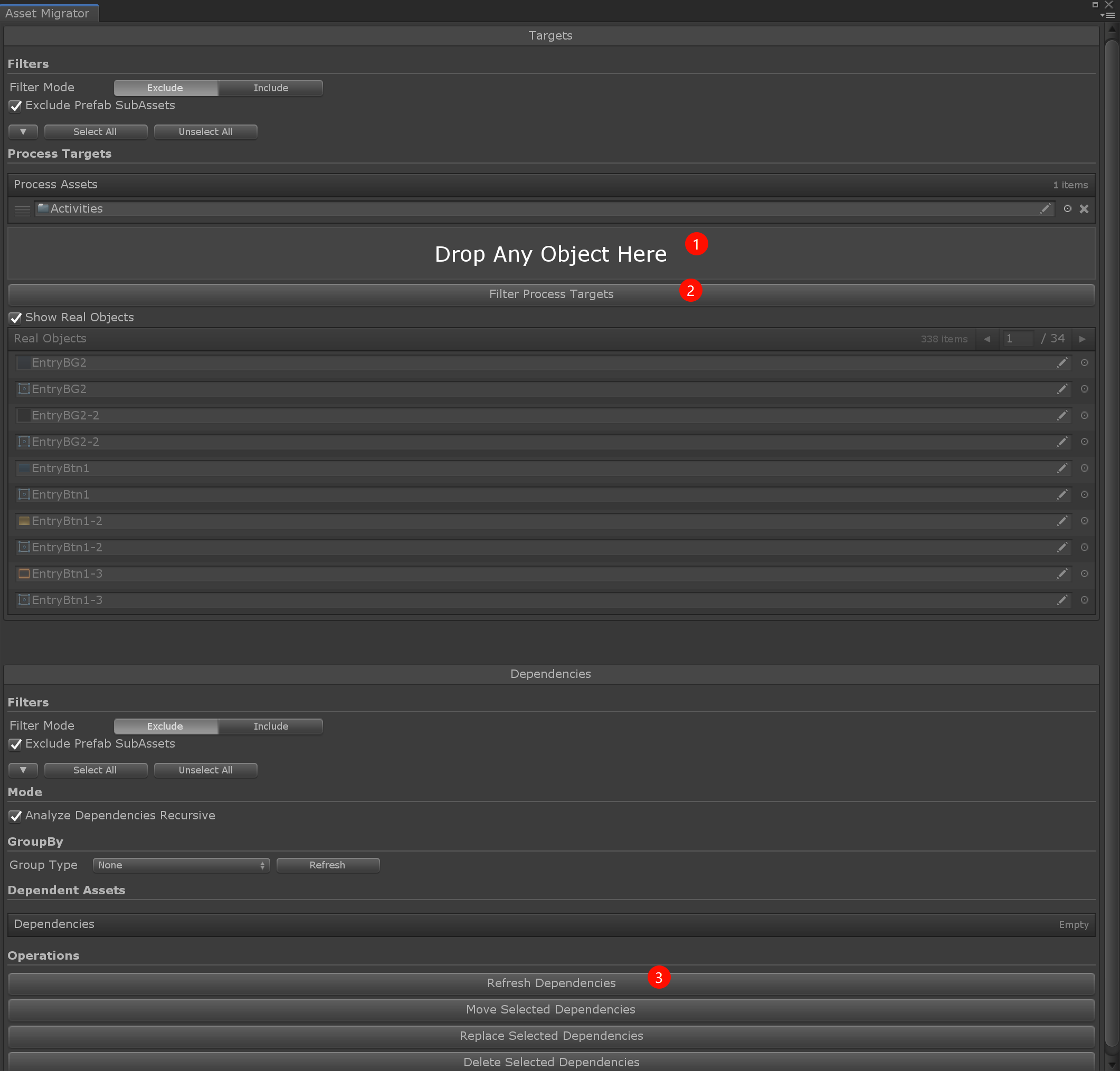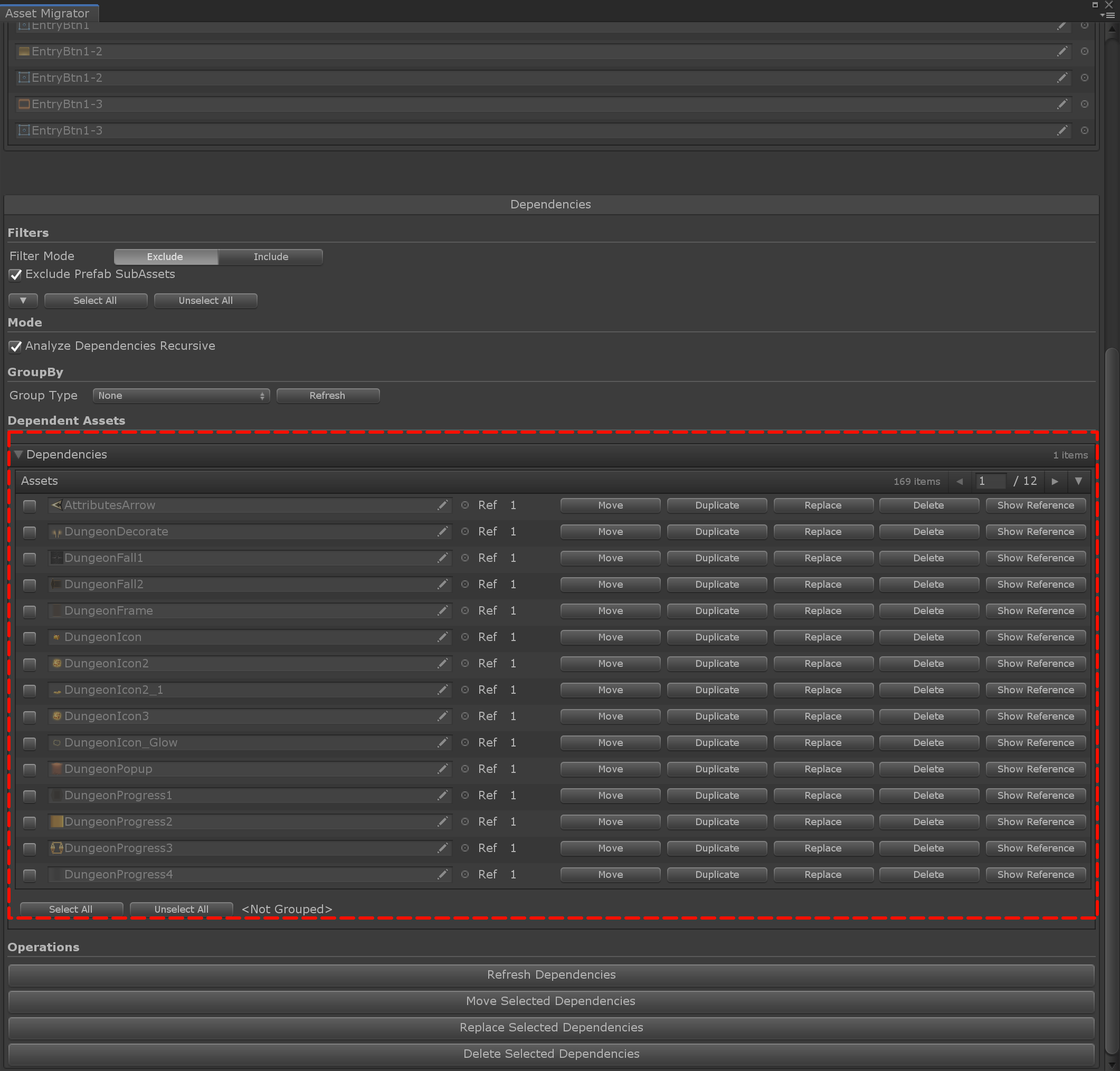 Move、Duplicate、Replace、Delete按钮即可进行相应的操作。如果需要批量进行,可先选择需要的资源,然后使用面板最底端的按钮即可。