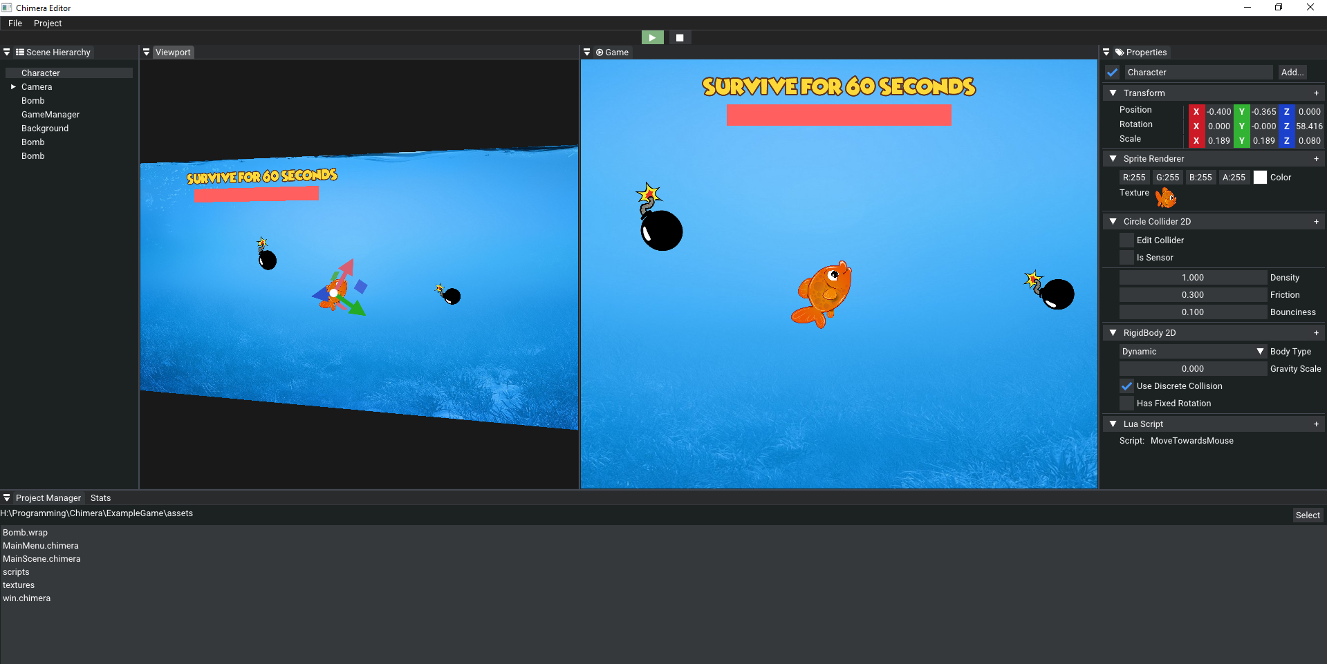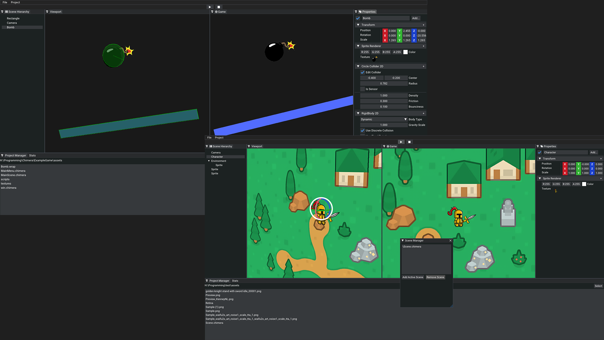 Chimera is a 2.5D game engine developed for learning purposes, but with the intent of becoming a usable piece of software where people can create games with, feat which has been achieved. The engine supports: