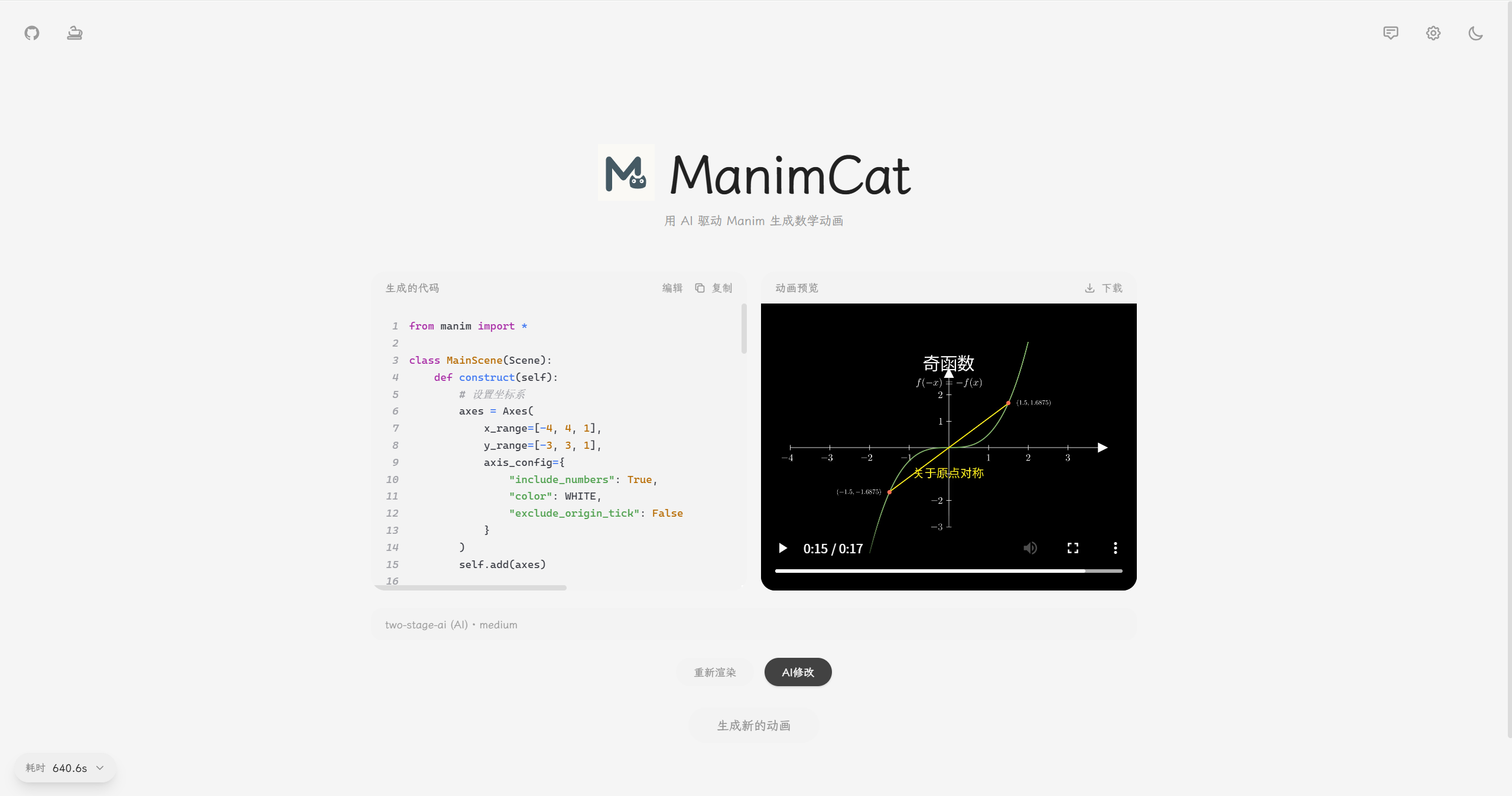 ManimCat 是一个基于 AI 的数学可视化生成平台,支持 video 与 image 两种输出模式,面向课堂教学与题目讲解场景。