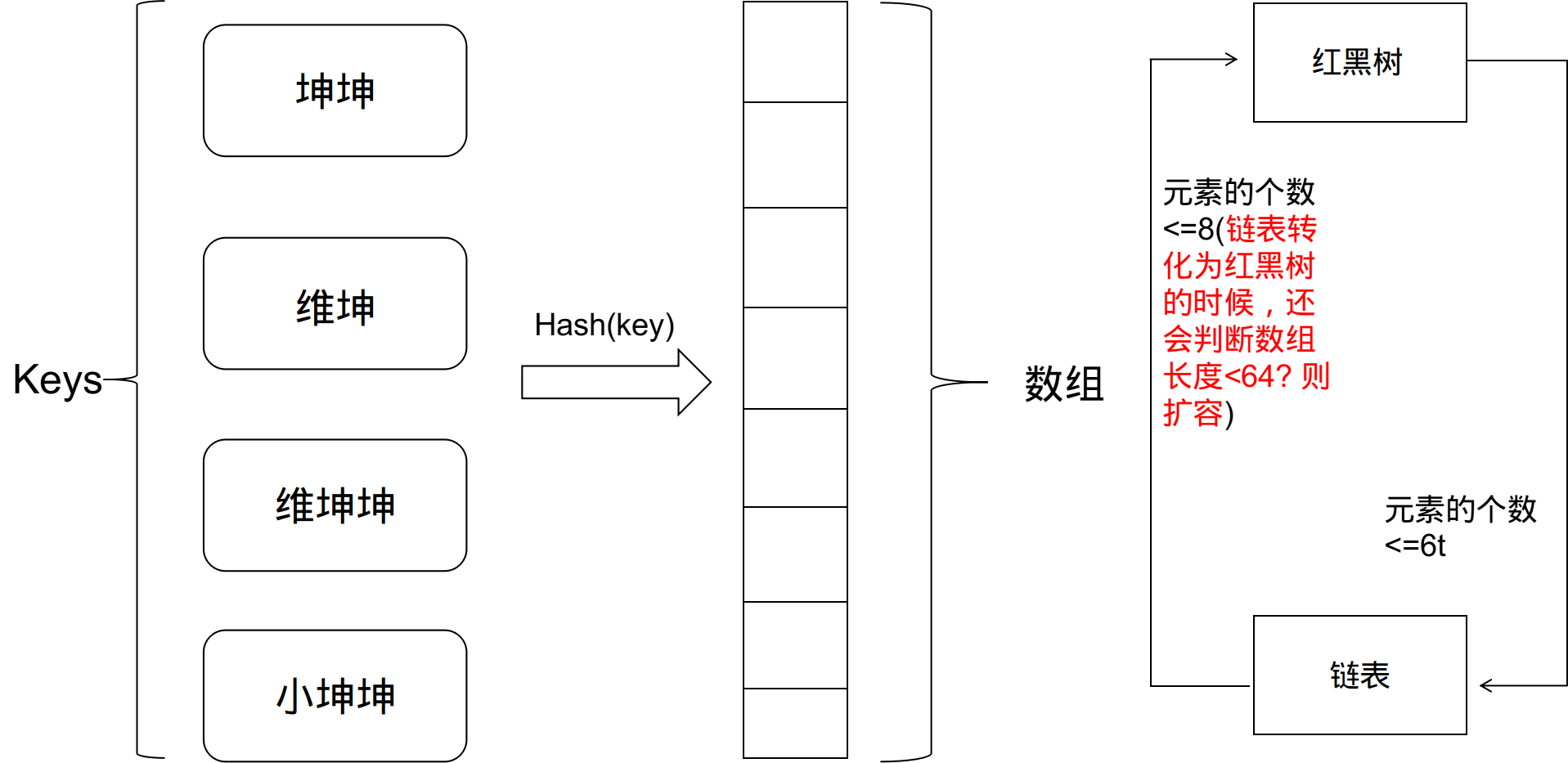 HashMap用于存放键值对,通过哈希表方式实现Map接口,是常用的Java集合之一,JDK1.8之前HashMap由数组+链表组成, 其使用的是数组进行存储, 之后使用链接法解决哈希冲突. JDK1.8之后HashMap在解决哈希冲突时, 与之前不同的是, 当链表长度大于阈值(默认是8), 将链表转化为红黑树, 避免过长的链表从而降低性能(过长的话, 就相当于使用的是链表存储的了,每次的查找都会导致O(n)的时间), 同时转化为红黑树的时候也会进行判断(将链表转换成红黑树前会判断,如果当前数组的长度小于 64,那么会选择先进行数组扩容,而不是转换为红黑树),以减少搜索时间。