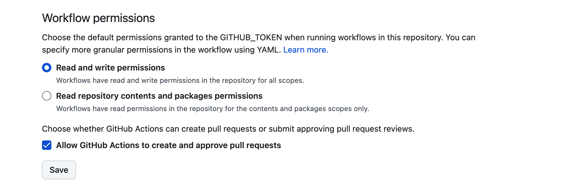 当前 repo 下,settings->actions->general,滑至最下方,设置Workflow permissions,如下::angry: