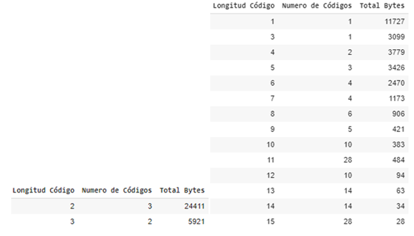 It can be seen in the previous tables that the code lengths are sorted in ascending order, this in order to improve the decoding process using chunks of the compressed chain of the shortest possible length and speed up response times due to the fact that the symbols encoded with a shorter code length are more likely to occur.