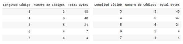 Summary tables of generated code lengths for the SARS-CoV-2.fasta e Información and el universo holográfico.txt data sets from left to right