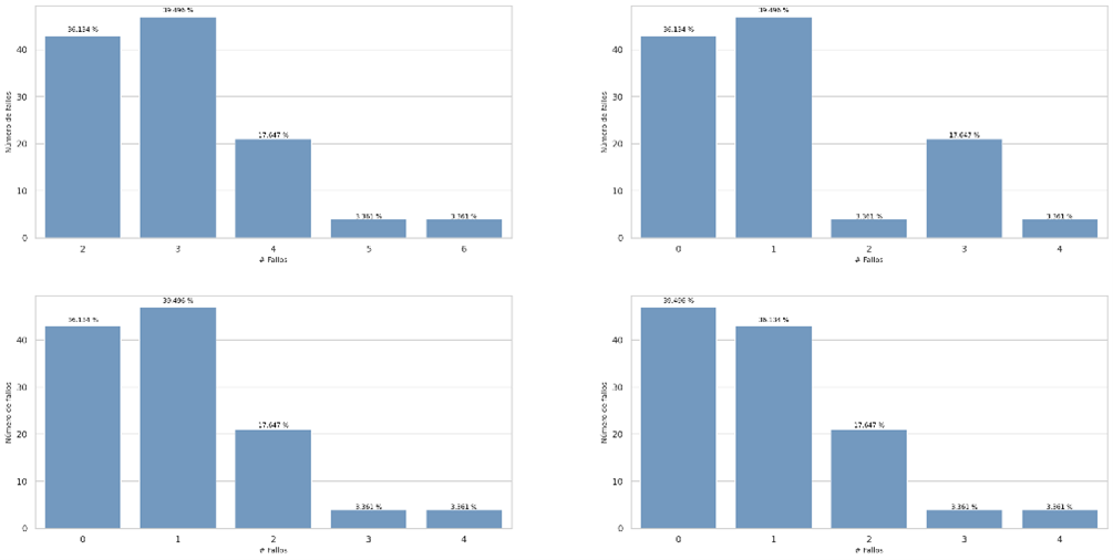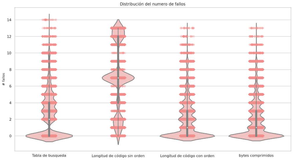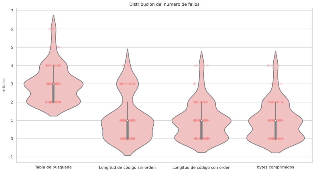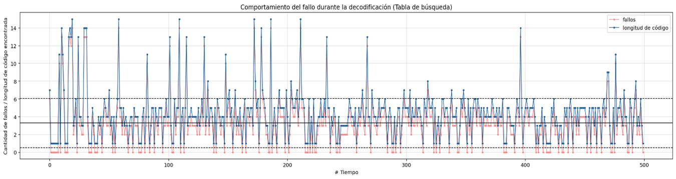 For the previous data set, decoding the 24 symbols of the compressed bitstream pattern has a cost of 35 attempts, although the symbols involved in the second equation are the different symbols that appear in the Huffman table, in this case they are 6 different symbols, the objective of measuring the failure is to find a relationship that leads us to reduce it to try to improve the overall response time of the algorithm.