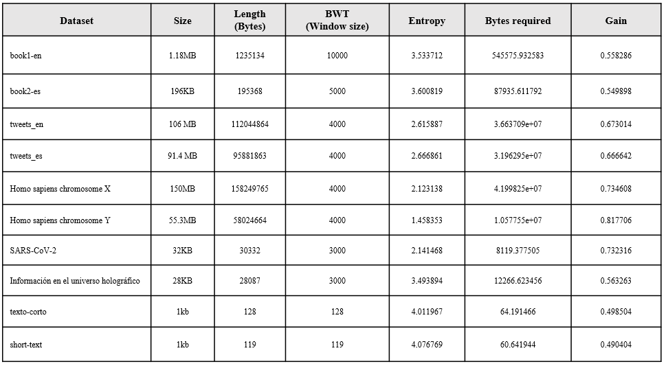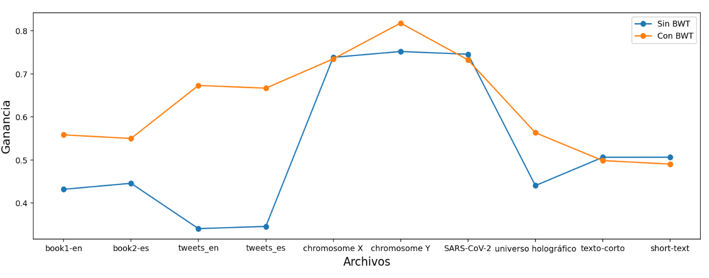 The files that will use the BWT and MTF in the compression pipeline are book1-en, book2-es, tweets_en, tweets_es, Homo sapiens chromosome Y and Information in the holographic universe, because they are the ones that present a significant gain.