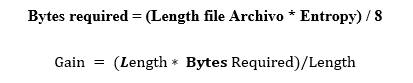 The Graphs with the distribution of symbols of each file are shown below. In most cases and because the content of some files is in natural language, Benford's law can be observed, there is a large amount of information accumulated in bytes that begin with the number 1, it can also be observed that there is a large amount of information accumulated in three-digit bytes, for .fasta files it can be observed the presence of a very short alphabet and special symbols that are related to the structure file standard, the last table in this section shows a numerical summary of the entropy analysis of each file, the necessary bytes and gain columns are related to the following formulas consecutively