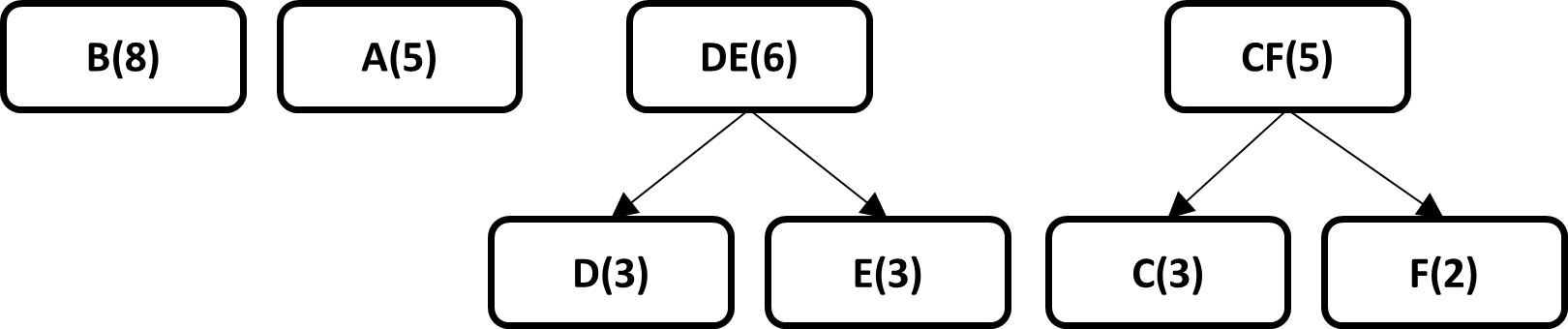 Taking into account that there are 6 different symbols contained in the original data set, the best way to represent each symbol is with 3 bits, since 6 is in 2^3, therefore, the original data set has 72 bits , the Huffman algorithm achieves a compressed string with a length of 59 bits