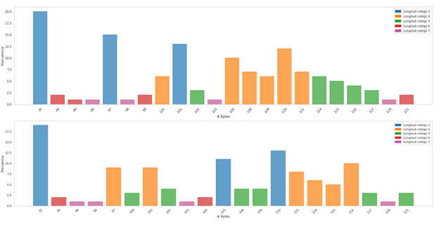 Below, the distribution of the code lengths per symbol for each dataset is shown, there are common features that are independent of the probability distribution of the symbols, we can see that for datasets that have information in natural language, most of the information is concentrated in symbols or bytes of length 3, another relevant feature that is common in uniform and non-uniform distributions is the presence of Benford's law, there are more symbols that begin with the number 1, the objective of this phase is to visualize that Symbol groups contain more information and what length of code is associated with them.
