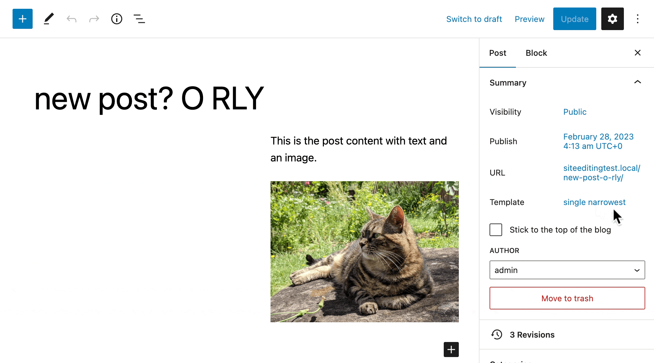 - In a block theme with more than one post (single) template, create a post and set it to use a non-default template.