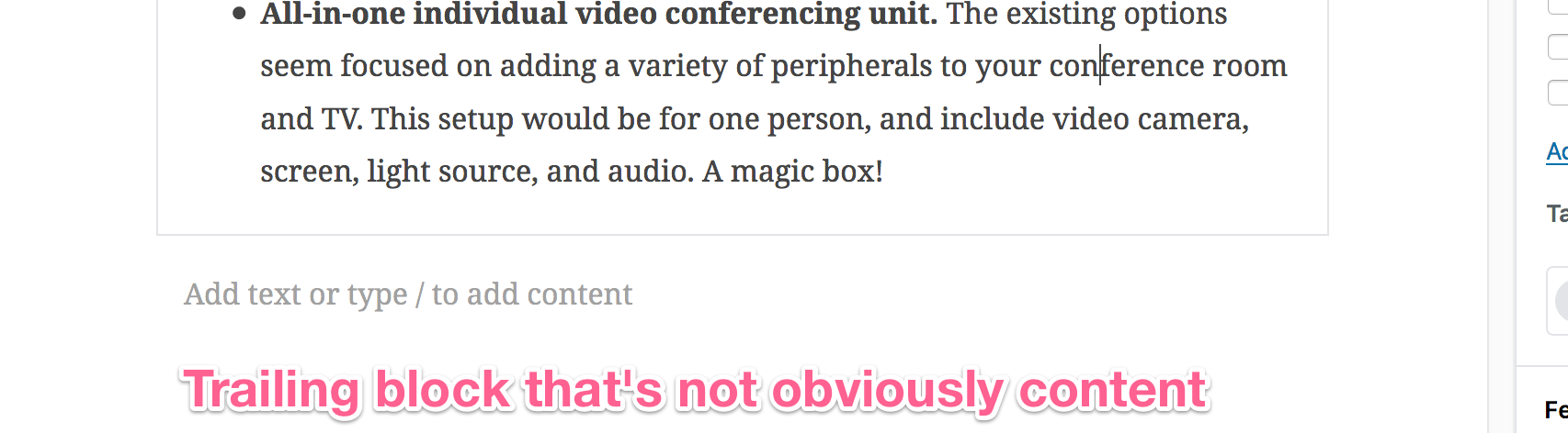 As a Gutenberg user, it's not obvious that the trailing default block needs to be removed in order to not be saved with the post content. I'd expect that my stored post content only represent the content I've produced.