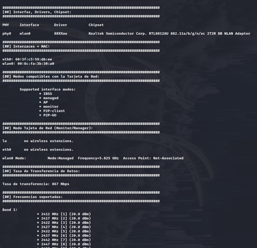 ☑️ Información Tarjeta de Red Wifi + Utilidades --> [Info Tarjeta de Red (Datos Técnicos, Interfaz, Drivers, Chipset, MACs, Modos Compatibles con la Tarjeta de Red (Modo Monitor, AP, P2P-client, etc), En que Modo se encuentra la Tarjeta de Red (Monitor o Managed), Tasa de Transferencia de Datos, Frecuencias Soportadas) Activar Modo Monitor (Activa el Modo Monitor y Cambia la MAC, NO HACE FALTA PARA USAR LA HERRAMIENTA), Restablecer Tarjeta de Red (Desactiva el Modo Monitor, Pone la MAC por defecto y Reinicia el NetworkManager)] [Ejemplo Gráfico]