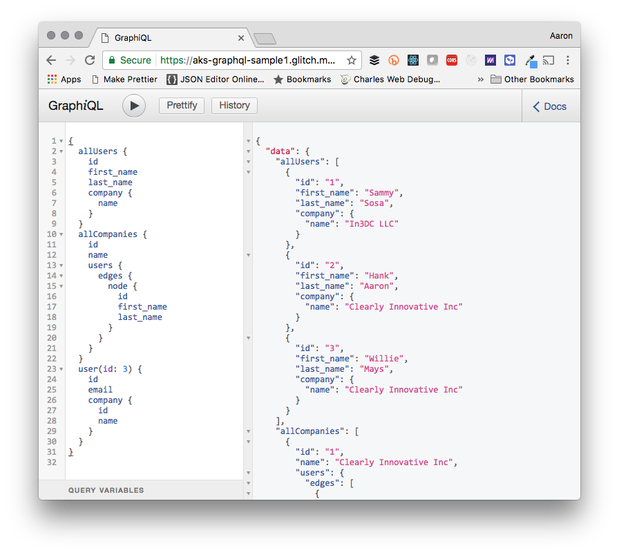 We have two objects, User and Company, we show the relationship between the two. We also show how to use relay connections to page through the results of the queries