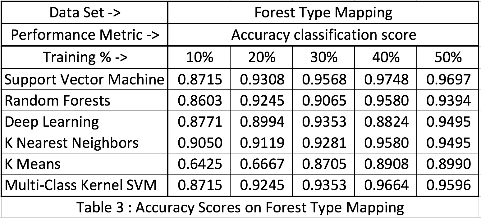 Data from all our datasets under consideration in divided into training and testing, ranging from 10% training / 90% testing to 50% training / 50% testing. After fitting the model onto the training set, we compare the prediced class labels from the test set to the actual class labels. The Accuracy Scores: